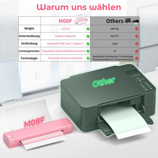 Betife Tragbarer Mobiler Drucker A4 Bluetooth Mini Drucker für die Reise, Kabelloser Thermodrucker ohne patronen unterstützt Thermopapier 210 x 297mm, Kompatibel mit Android iOS Mac (Rosa)